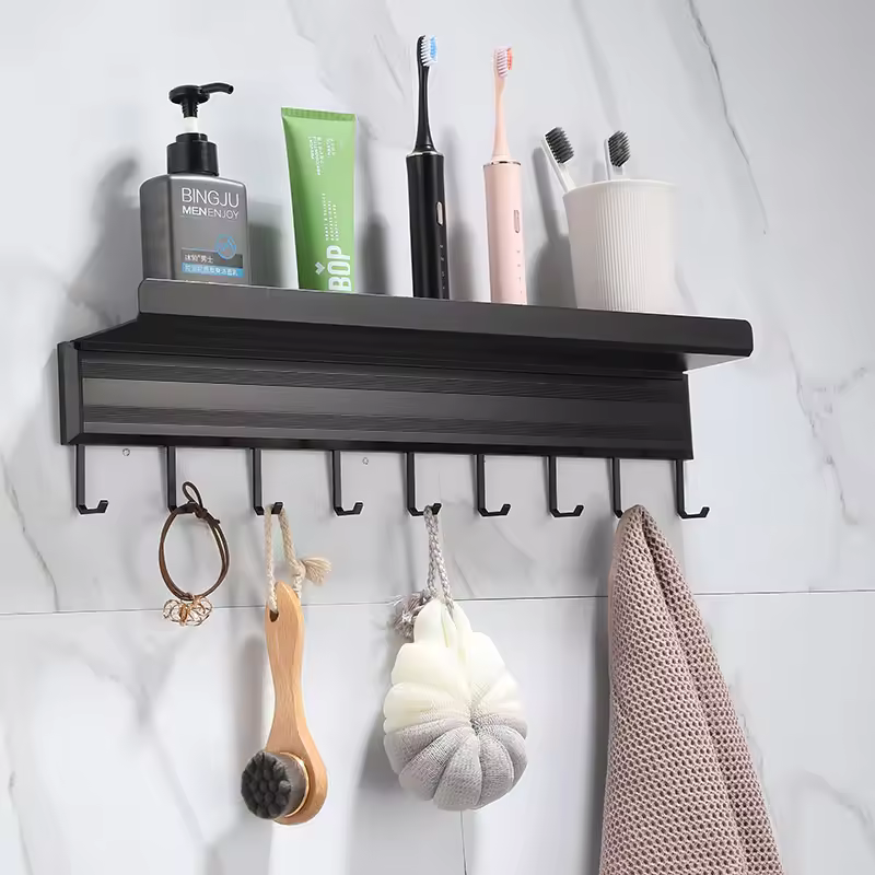 Organize your kitchen efficiently with this modern black wall-mounted kitchen organizer rack. Designed to maximize vertical space, it keeps your countertops clear while storing essential items within easy reach. The rack features multiple hooks and a spacious shelf, perfect for hanging utensils, mugs, spices, condiments, and other kitchen essentials.