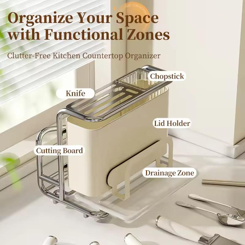 CST Customizable Metal Kitchen Organizer Rack – Multifunctional rack with knife storage and chopping board holder. Durable, space-saving design keeps your kitchen organized, safe, and stylish.